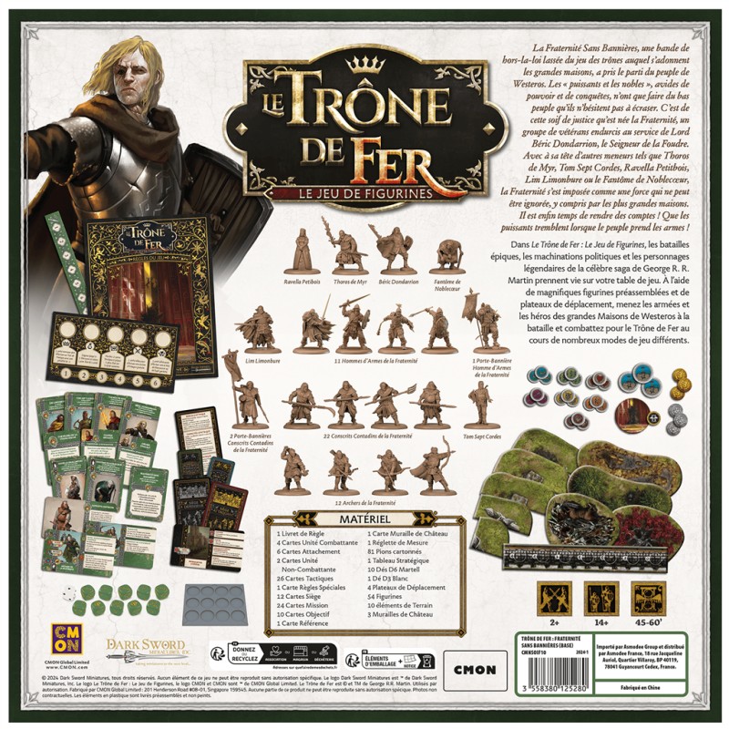 Description du produitLa Fraternité Sans Bannières, une bande de hors-la-loi lassée du jeu des trônes auquel s’adonnent les grandes maisons, a pris le parti du peuple de Westeros. Les « puissants et les nobles », avides de pouvoir et de conquêtes, n’ont que faire du bas peuple qu’ils n’hésitent pas à écraser. C’est de cette soif de justice qu’est née la Fraternité, un groupe de vétérans endurcis au service de Lord Béric Dondarrion, le Seigneur de la Foudre. Avec à sa tête d’autres meneurs tels que Thoros de Myr, Tom Sept Cordes, Ravella Petitbois, Lim Limonbure ou le Fantôme de Noblecœur, la Fraternité s’est imposée comme une force qui ne peut être ignorée, y compris par les plus grandes maisons. Il est enfin temps de rendre des comptes ! Que les puissants tremblent lorsque le peuple prend les armes !
