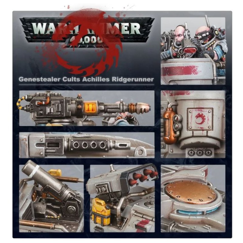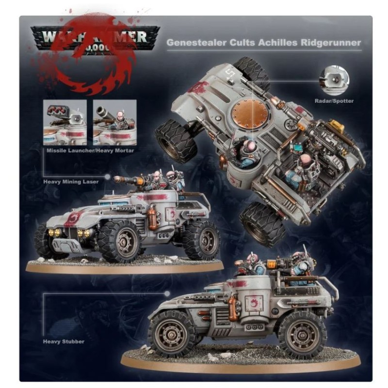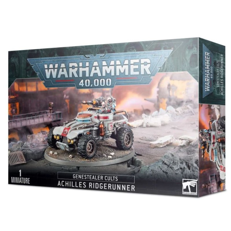 Les Achilles Ridgerunners sont des buggies doués d'une grande vitesse et capables d'emporter un armement conséquent. Ils peuvent aussi tenir lieu de véhicules de soutien précieux pour les unités d'Atalan Jackals, et leur conférer un surcroît de mobilité. Munis de deux mitrailleuses, ils peuvent aussi être pourvus d'un laser minier lourd, d'un mortier lourd ou d'un lance-missiles, ce qui offre à tout joueur des Genestealer Cults les outils pour gérer n'importe quel ennemi.