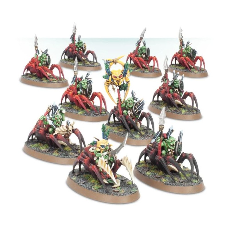 Ce kit plastique contient 10 Grot Spider Riders armés de lances crochues et d'arcs-araignées, et comprend les options pour assembler un Spider Rider Boss, un porte-icône et un tambour d'os.