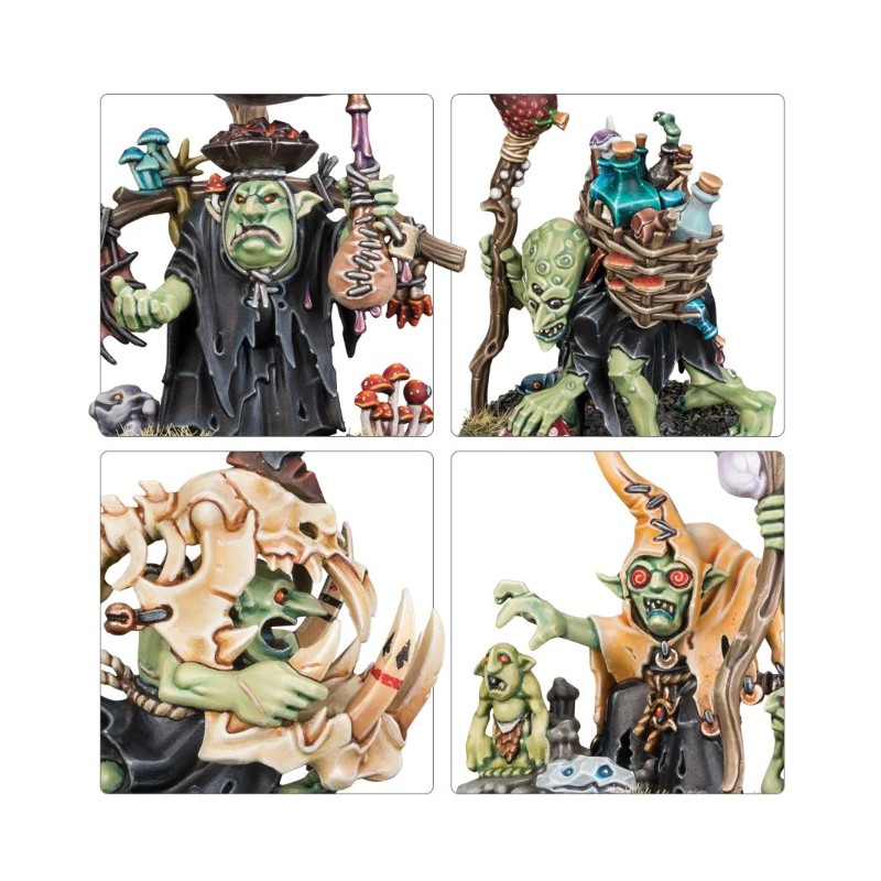Grâce à ce kit, vous pouvez monter tout un Gobbapalooza – un concile de Grots qui propose à votre armée un large éventail de tours à jouer. Pris ensemble mais déployés séparément, ses membres ont chacun des aptitudes uniques et puissantes. Vous trouverez là cinq héros: