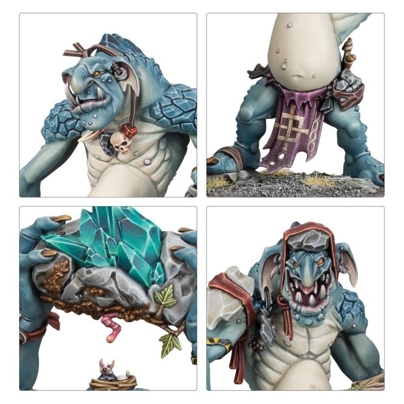 Cette boîte pleine à craquer est parfaite pour entamer une nouvelle collection de Vils du Fielobscur ou pour étoffer une armée existante, que vous pourrez ensuite déchaîner dans les parties de Warhammer Age of Sigmar tout en faisant des économies par rapport à un achat des kits au détail. L'intégralité de cette force est composée de Troggoths, dont un noyau de Troggoths Ventreroc anguleux et une unité de répugnants Troggoths Palustres, qui frappent fort et sont extrêmement difficiles à abattre. Ils sont menés par Trugg, le Roi des Troggoths, une brute colossale quasiment inarrêtable sur le champ de bataille, et soutenus par un énorme Troggoth des Moit'gîtes. Ces cogneurs ne manqueront pas de donner une migraine carabinée à vos adversaires.