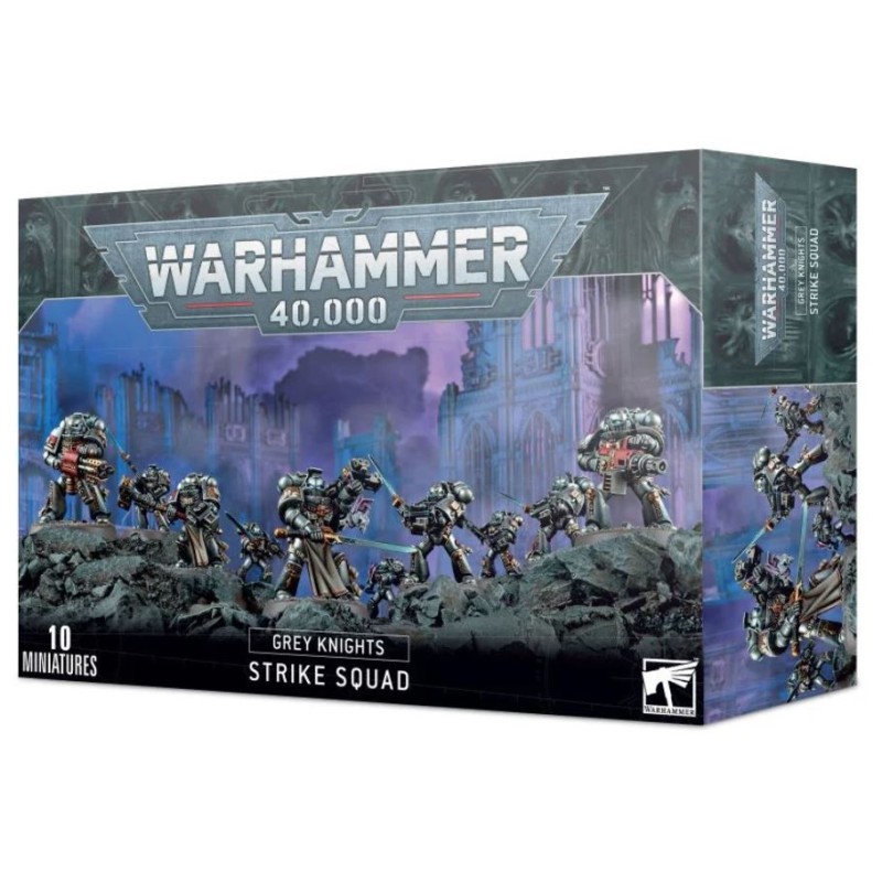 La boîte contient 236 pièces et dix socles de 25mm permettant d'assembler une Grey Knight Strike Squad.