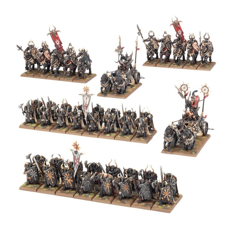 Cette boîte vous fournit un noyau solide pour une puissante armée de Guerriers du Chaos. Elle s'articule autour de Chevaliers du Chaos, champions favoris des Puissances de la Ruines, protégés par de sombres armures de fer et montés sur des destriers enragés. Ces puissants cavaliers sont soutenus par des Guerriers du Chaos, une infanterie d'élite équipée d'armes mortelles. Les Guerriers et les Chevaliers du Chaos disposent de diverses options d'armes ainsi que d'éléments servant à distinguer certains membres de leurs unités comme champions, porte-étendard et musiciens. Ces tueurs inflexibles sont rejoints par deux Chars du Chaos. Rien ne peut arrêter la charge de ces véhicules en fer couverts de sang, sinon un rempart de château. Vous pouvez autrement les assembler comme Chars Éventreurs.