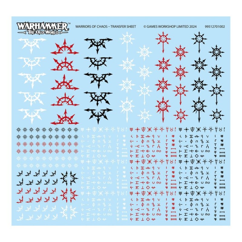 Ce kit est composé de 148 éléments en plastique, et il est fourni avec 2x Socles Rectangulaires Citadel de 50x100mm. Ce set inclut aussi 1x Planche de Décalcos des Guerriers du Chaos proposant 621x Décalcos de haute qualité pour personnaliser davantage vos forces.