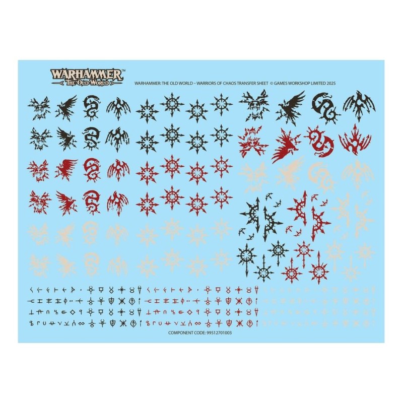 Ce kit est fourni avec 1x Planche de Décalcos des Guerriers du Chaos, proposant 246 décalcos de grande qualité pour décorer vos figurines. Cela inclut des symboles des cultes du Chien Sanglant, du Serpent Sinueux, de la Corneille Noire et du Rapace Néfaste, ainsi que d'autres symboles du Chaos et runes maudites.