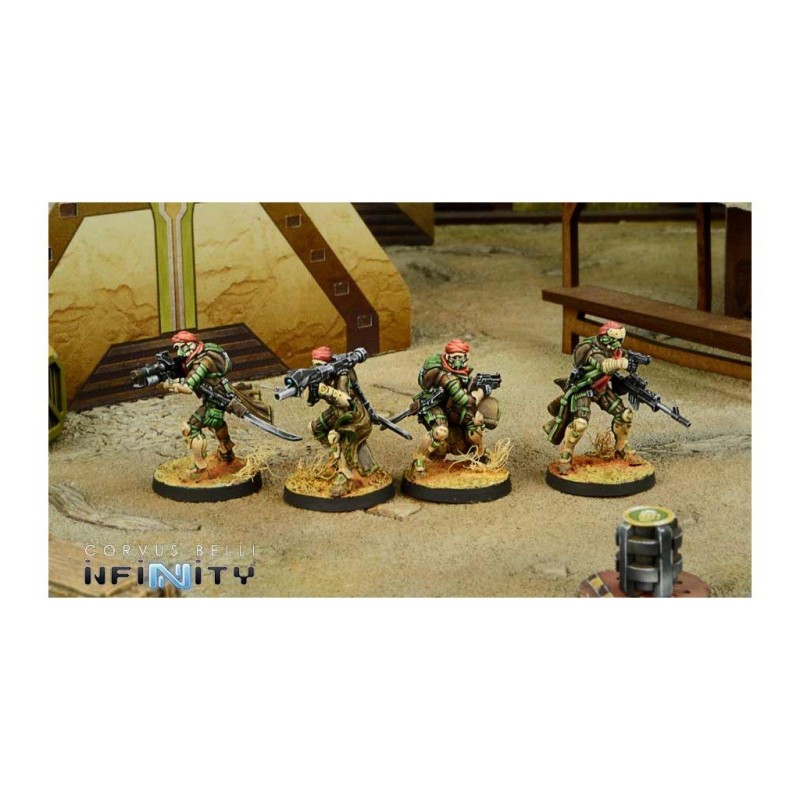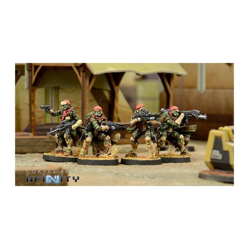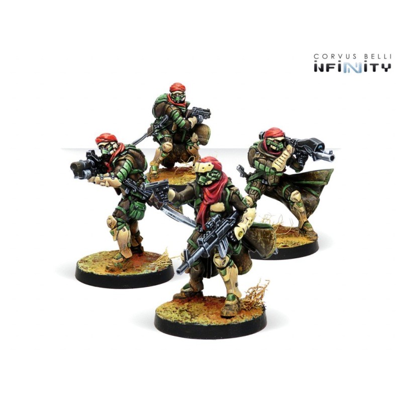 Cette boite contient 4 figurines en métal pour le jeu Infinity. Les socles sont inclus. Les figurines sont à assembler et à peindre.