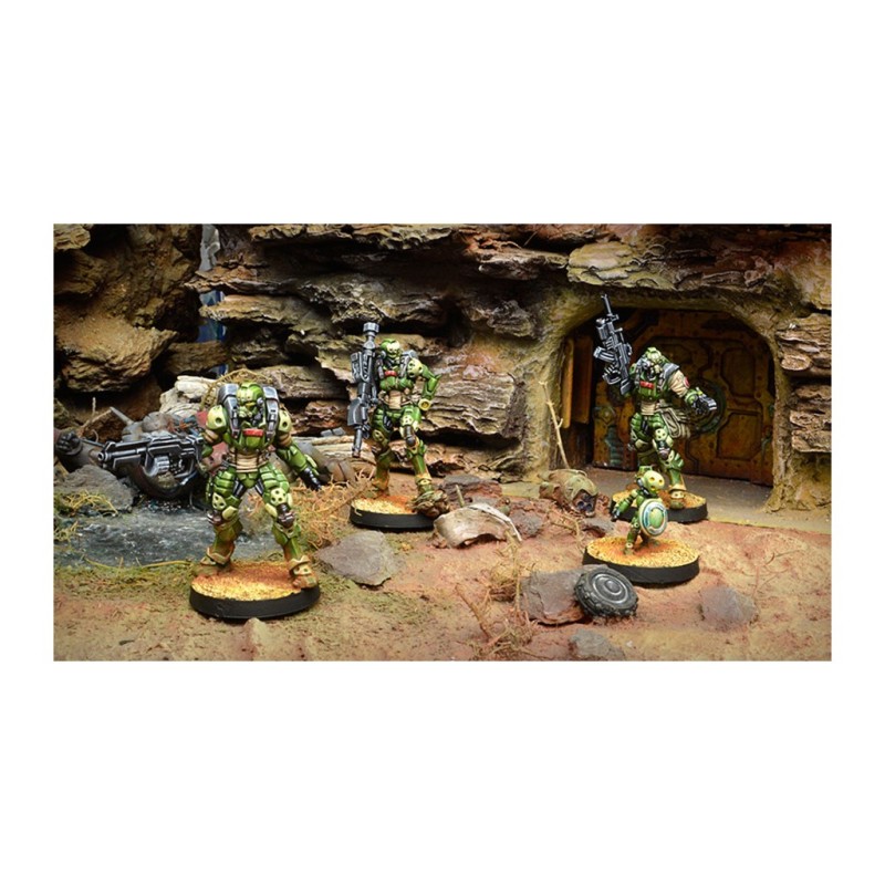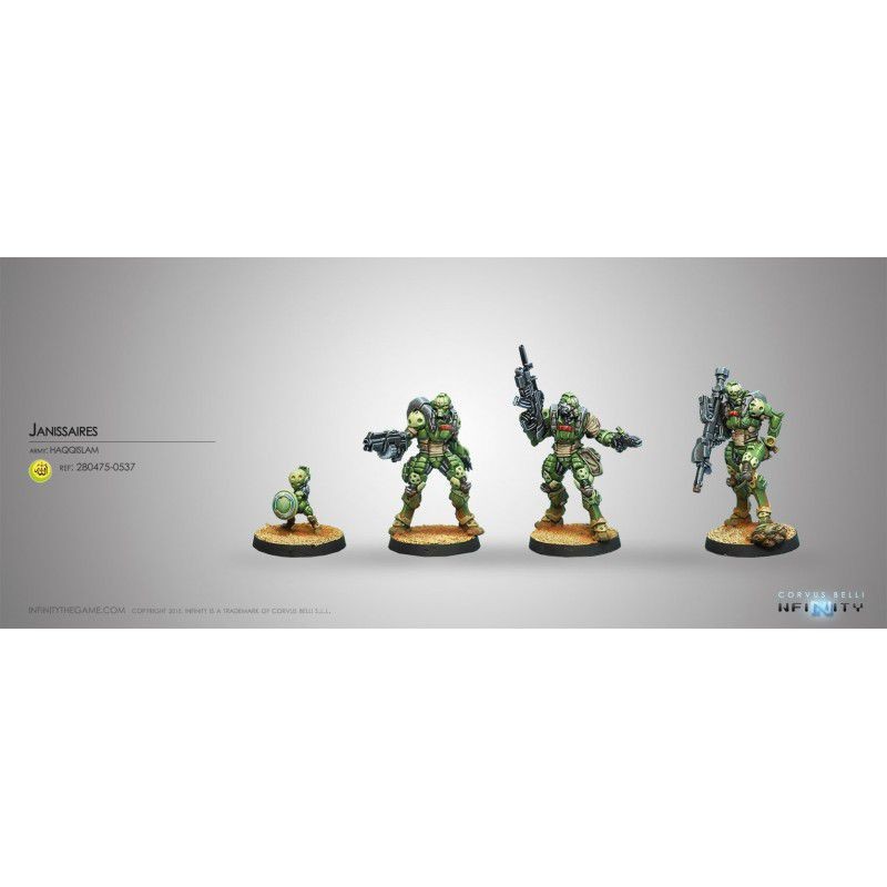 Description du produitLes Janissaires sont un régiment d'infanterie lourde, entraîné à un degré épouvantable pour combattre et résister jusqu'au dernier homme. Dotés d'exosquelettes tactiques blindés, leur mission est de résister au pire des combats. Le Régiment des Janissaires est composé des orphelins, des Donnés et des Délivrés. Ses membres sont recrutés dans les orphelinats de Funduq et parmi les enfants de non-Haqqislamites donnés gracieusement au service du Haqqislam. Le gouvernement accepte que ces enfants se convertissent à la seule Vraie Foi et en signe de l'engagement et de la loyauté de leurs parents. Dans les colonies situées dans certains des quartiers les plus inhospitaliers de Bourak, de nombreux parents dhimmi, adeptes d'autres religions, donnent un de leurs enfants pour qu'ils aient une meilleure éducation dans la ville et, avec elle, de meilleures perspectives. Certains de ces enfants sont envoyés dans des centres d'entraînement très performants autour de Funduq, où ils sont éduqués dans le credo Haqqislamite et dans la vie militaire.