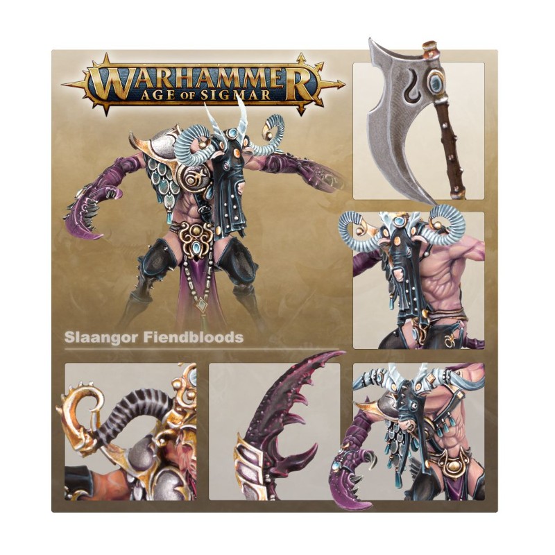 Ce kit plastique en 37 composants permet d'assembler 3 figurines de Slaangor Fiendbloods (dont l'une peut devenir Slake-Horn, en guise de chef d'unité). Chaque figurine est fournie avec un socle rond Citadel de 40mm.