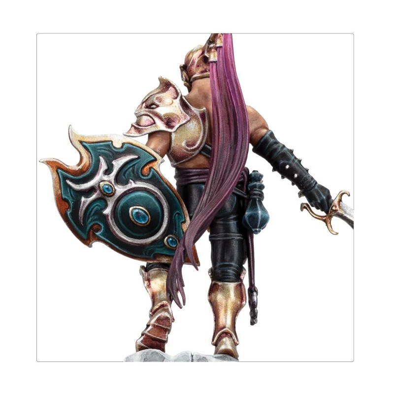 Ce kit plastique permet d'assembler un Seigneur de l'Orgueil, un duelliste d'une arrogance extrême et d'une adresse assortie. Ce combattant élégant manie un cimeterre finement forgé, écarté de son torse nu dans un geste évident de défi. Son bouclier et son armure légère sont décorés de garnitures délicates, du symbole de Slaanesh, et d'un visage grimaçant – parfait pour un guerrier aussi prestigieux – tandis que les passements de sa coiffe ondulent derrière lui, tel un rideau de théâtre s'ouvrant sur le duel imminent.