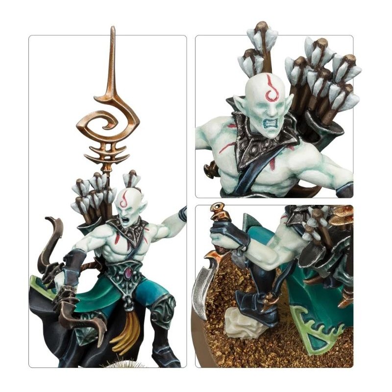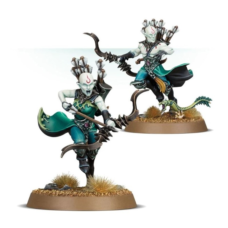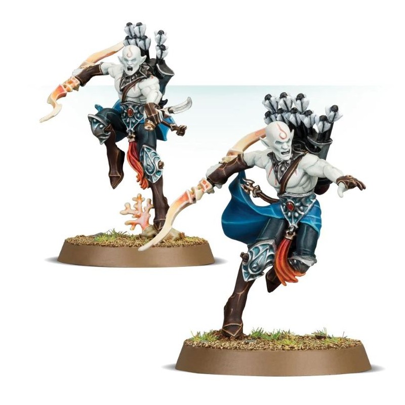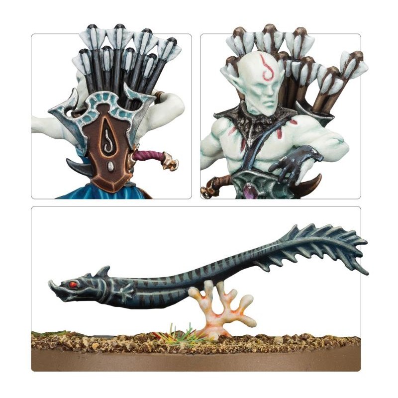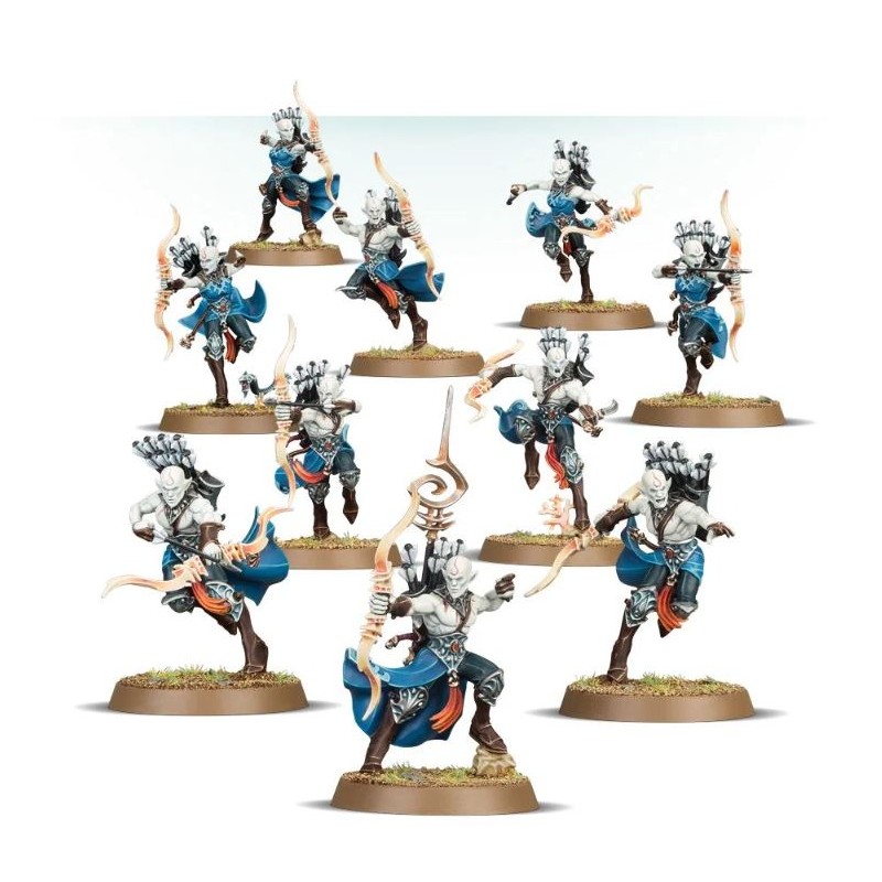 Description du produitLes Namarti Reavers fournissent les archers et les éclaireurs aux phalanges Idoneth Deepkin. Les Akhelians apprécient l’importance tactique de la reconnaissance, des piquets et des tirs concentrés, mais ils considèrent de tels devoirs indignes d’eux. Les Reavers sont donc recrutés parmi les plus rapides et les plus agiles des Namarti. Ils apprennent à viser rapidement et à tirer avec le silencieux arc-murmure, et à se défendre avec des lames courtes conçues pour frapper d’estoc. Au combat, les Namarti Reavers se déplacent avec célérité, tels la vague de proue qui annonce la tempête. Ils testent les défenses, cherchent un point vulnérable et harcèlent les éléments les plus dangereux de l’ennemi pour détourner l’attention de l’adversaire tandis que les Akhelians préparent leur charge dévastatrice.