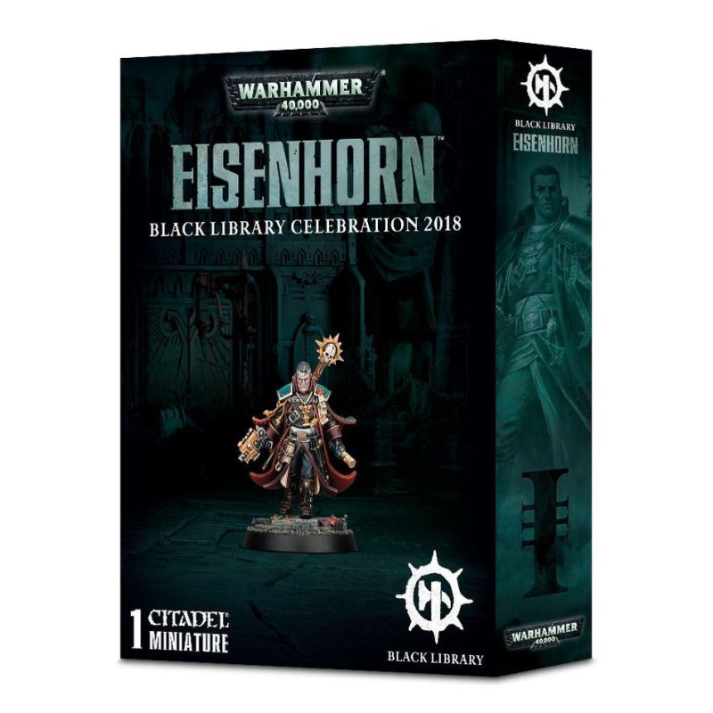 Ce kit résine contient les composants nécessaires pour assembler Eisenhorn. La figurine dépeint ledit Eisenhorn tel qu'il était dans sa jeunesse, avec ses pommettes bien marquées, sa mâchoire carrée et ses cheveux gominés, avec son air impérieux et sévère d'inquisiteur. Il porte les instruments grâce auxquels il accomplit son devoir – un pistolet bolter d'artificier dans la main droite, un sceptre runique sanglé dans son dos avec des rouleaux de parchemins inquisitoriaux et une grenade électrofléau, plus son épée, Barbarisator, dans son fourreau de ceinture. Il tient un autre rouleau de parchemin dans la main gauche, et il porte au cou un sceau de l'Inquisition plus un aquila, ce qui fait du sujet un parangon d'iconographie impériale. Il y a même un sceau de pureté sur l'épaulière gauche de son armure combinée à son manteau. Le socle comporte un symbole de l'Inquisition craquelé sur lequel Eisenhorn marche résolument – ce qui évoque son passage de puritain à radical. Le socle est aussi orné de bolts et d'un crâne cornu.