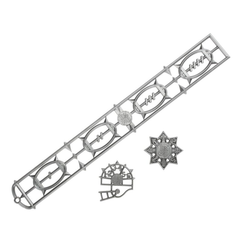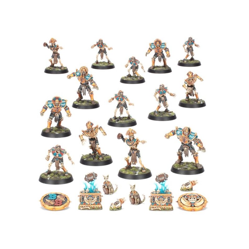 – 14 joueurs Rois des Tombes en plastique de couleur os: 2x Blitzers, 2x Lanceurs, 4x Gardiens des Tombes et 6x Trois-quarts Squelettes, ainsi que des pions, des marqueurs de Relance, et des ballons supplémentaires