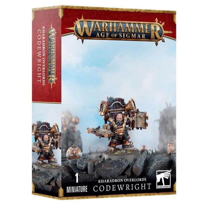 Ce kit plastique permet d'assembler un Codificateur, un juriste des Magnats Kharadrons connaissant les lois sur le bout des doigts. Armé de son savoir, et d'un pistolet à munitions éthériques, les actions du Codificateur sont soutenues par le lourd biblioharnais qu'il porte sur le dos. Cet appareil doté de plusieurs bras comportant une bibliothèque entière de textes duardins, ainsi qu'un haut-parleur avec lequel il prononce ses jugements. Il peut également utiliser ses membres renforcés par des pistons pour frapper les ennemis impertinents à coups de grimoire si nécessaire. Tout ça en écrivant de nouvelles notes de bas de page à la volée.