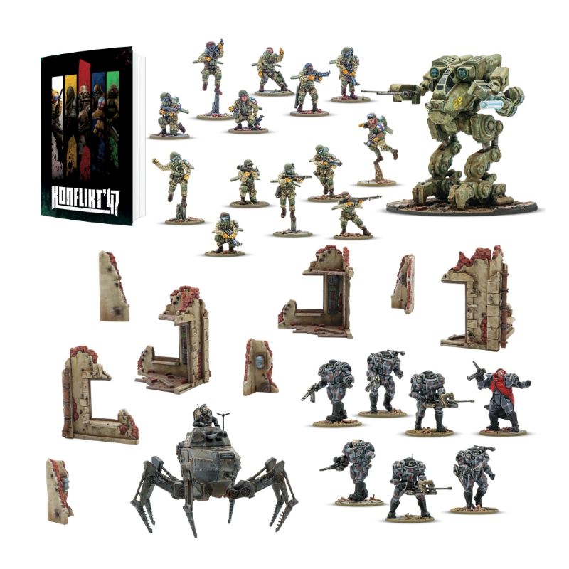 Ce kit de démarrage contient tout ce dont vous avez besoin pour commencer à jouer à Konflikt '47 : livret de règles, figurines, dés, décors et bien plus encore.