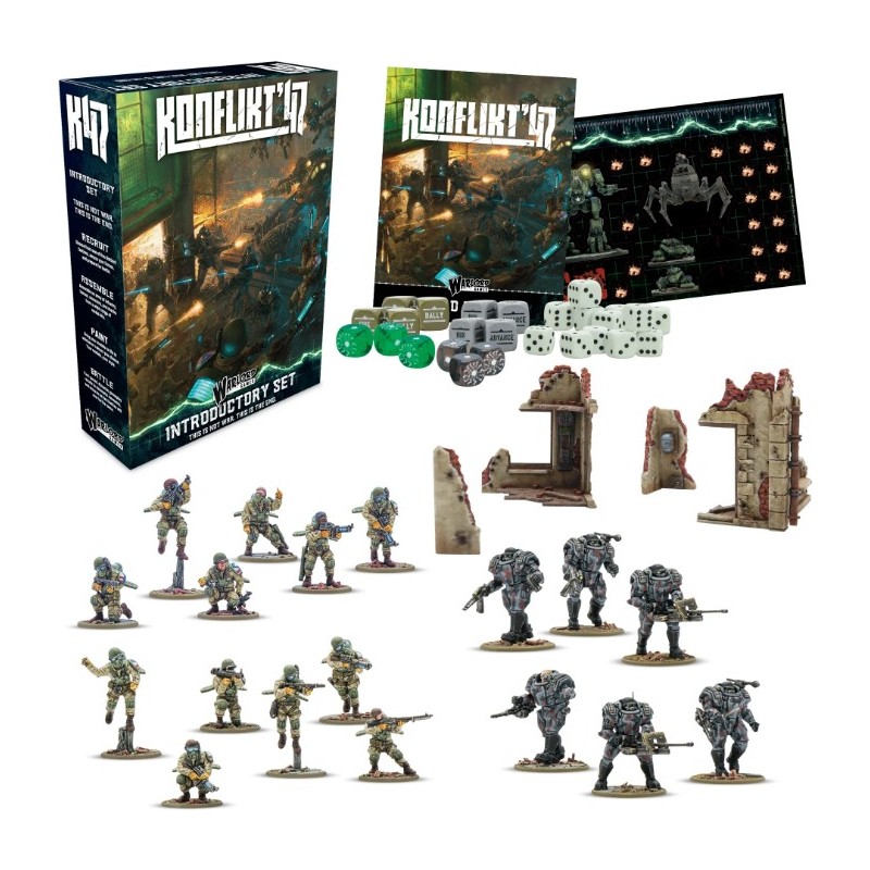 Ce kit de démarrage contient tout ce dont vous avez besoin pour commencer à jouer à Konflikt '47 : livret de règles, figurines, dés, décors et bien plus encore.