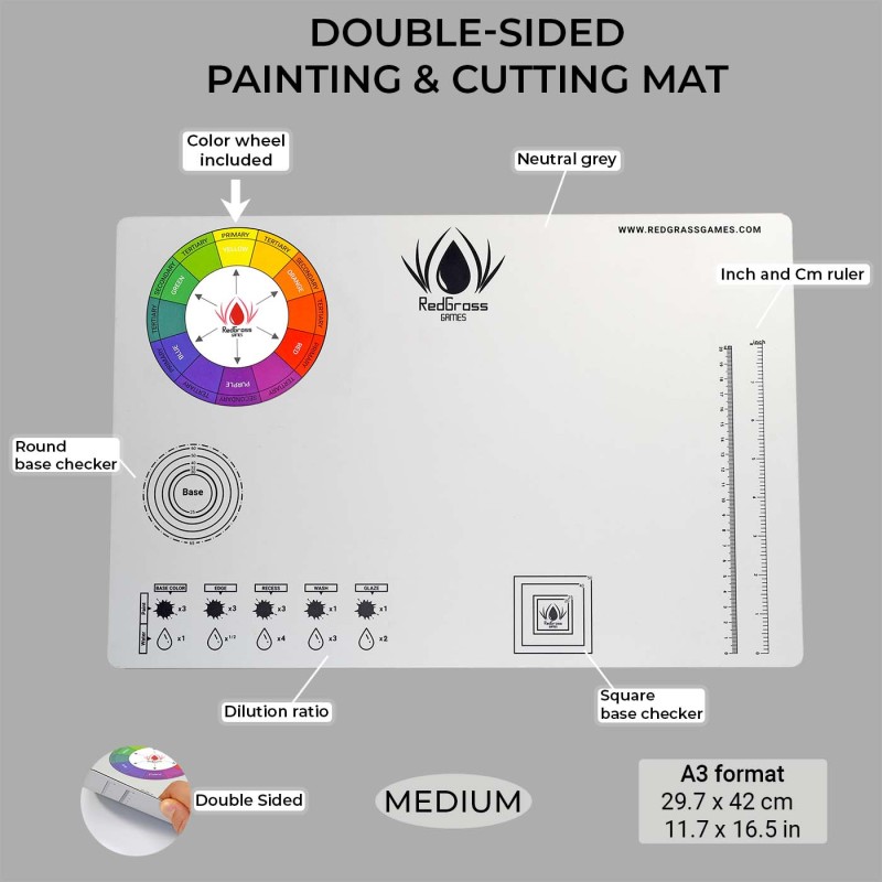 Gris neutre pour une meilleure précision des couleurs pendant la peinture. Une multitude de guides et de mesures utiles sur les deux faces.