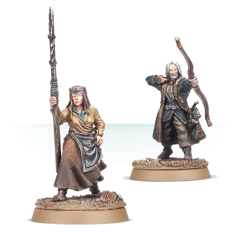 Ce kit en résine en plusieurs parties contient les composants nécessaires à l'assemblage de Hilda Bianca & Percy, Héros de Lake-town. Hilda Bianca est posée de manière provocante, en écartant ses jupes d'une main, une énorme lance de pêche barbelée dans l'autre. Percy, avec ses longs cheveux et sa barbe détaillés, manie son arc dans sa main gauche, le tirant en arrière avec l'autre. Sur sa hanche est modelé un carquois, dépassant de son pardessus.