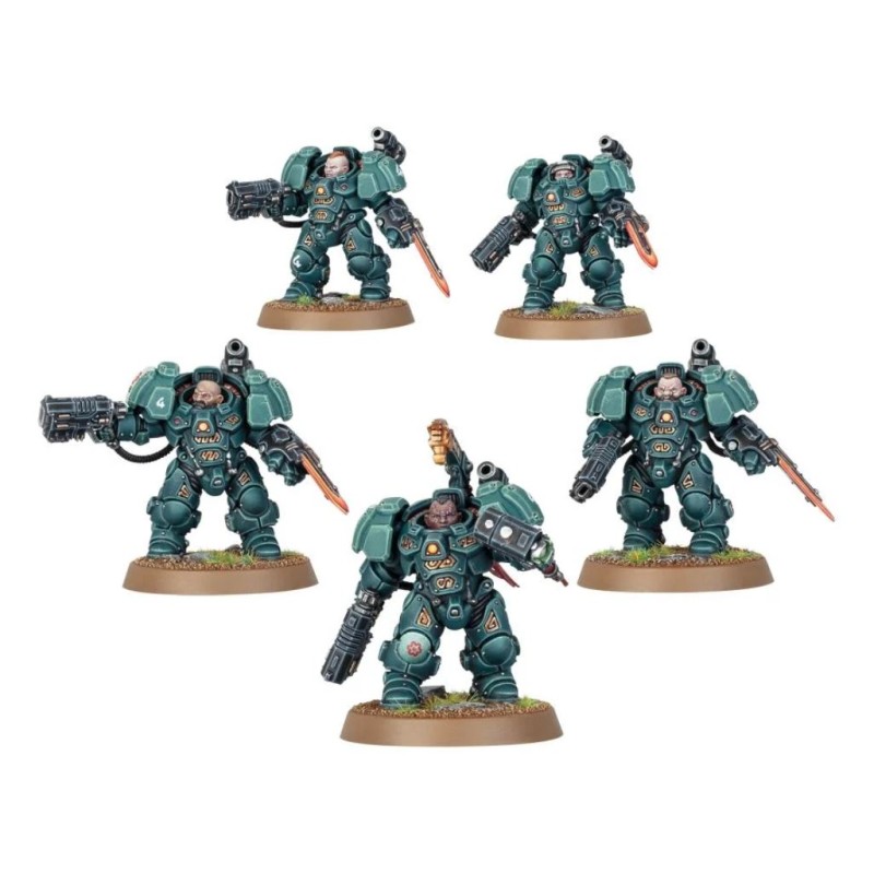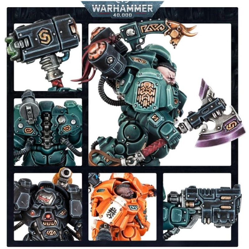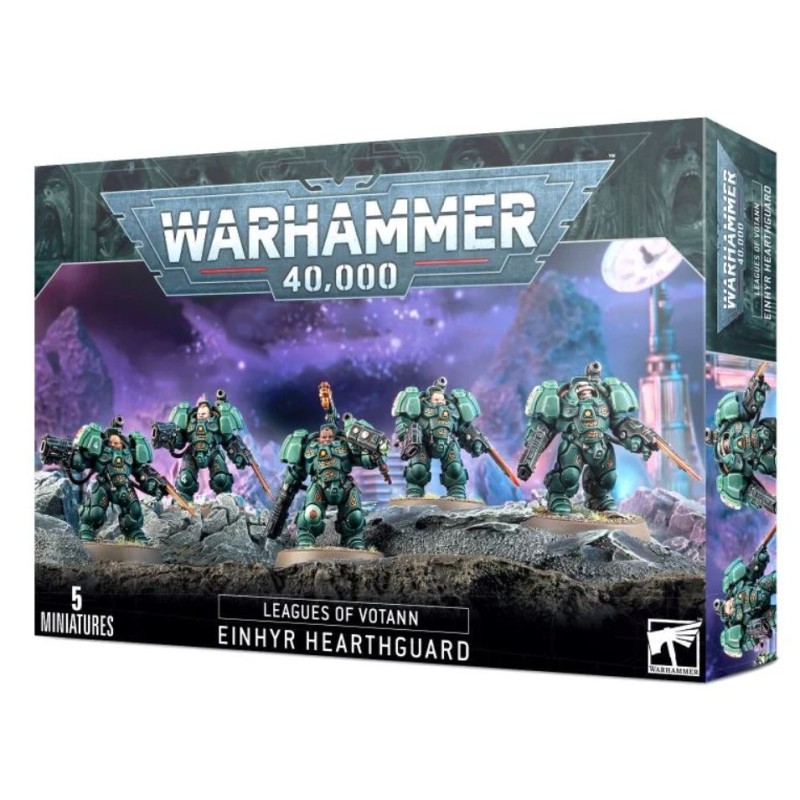 Ce kit plastique permet d'assembler cinq Âtregardes Einhyrs, des Cognats d'élite équipés des meilleures armes et armures à leur disposition. Les exo-scaphandres massifs et couverts de runes leur permettent d'encaisser les tirs concentrés de leurs ennemis, et incorporent un lance-grenade monté sur l'épaule. Chaque figurine peut être équipée de diverses armes de tir et de mêlée : un fusil à plasma EtaCarn ou un désintégrateur volkanite pour répandre la destruction à distance, et un gantelet à percussion ou un gantelet-lame à plasma pour les combats au corps à corps. Ce kit contient 19 têtes interchangeables : 12 têtes nues uniques, cinq casques et deux heaumes avec visière ouverte. Une figurine peut être assemblée comme chef Hesyr équipé d'un marteau à percussion et d'un cimier au choix parmi deux.