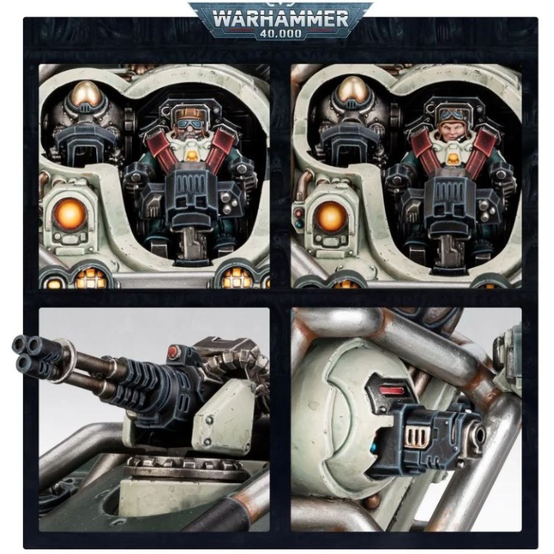 L'Hekaton dispose également d'un autocanon MATi-R tourné vers l'arrière et un scanner panspectral pouvant être remplacé par un silo de missiles, contenant une ogive d'ire des Cognats, brise-montagne ou de vengeance ancestrale. Le char dispose de plaques de blindage renforcées, de trappes de transport sur tous les flancs pour déposer sa cargaison pugnace, et d'un pilote visible sous un écran de plastique transparent. Le kit contient trois têtes différentes pour personnaliser votre pilote, ainsi que des phares optionnels pour les arceaux avant.