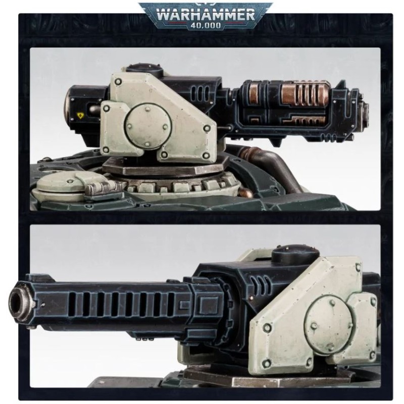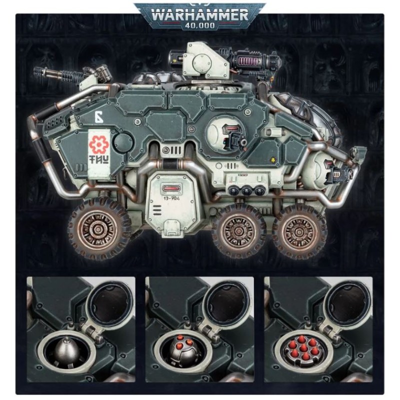 Ce kit plastique permet d'assembler une Forteresse Mobile Hekaton, un transport lourd inexorable bardé d'armes puissantes. Cet impressionnant véhicule à six roues peut être assemblé avec trois armes de tourelle ajustables et dévastatrices : un cyclo-canon à ions pour abattre l'infanterie lourde la plus résistante, un faisceau de conversion SP pour transpercer n'importe quelle cible, ou un canon à magna-rail lourd capable de réduire même les chars les plus robustes à l'état de scories. Cette arme principale est renforcée par deux paires d'armes en tourelle boule ajustables, au choix des canons bolters ou des faisceaux à ions.