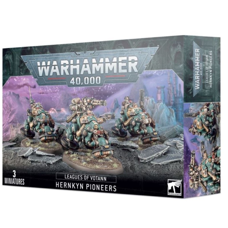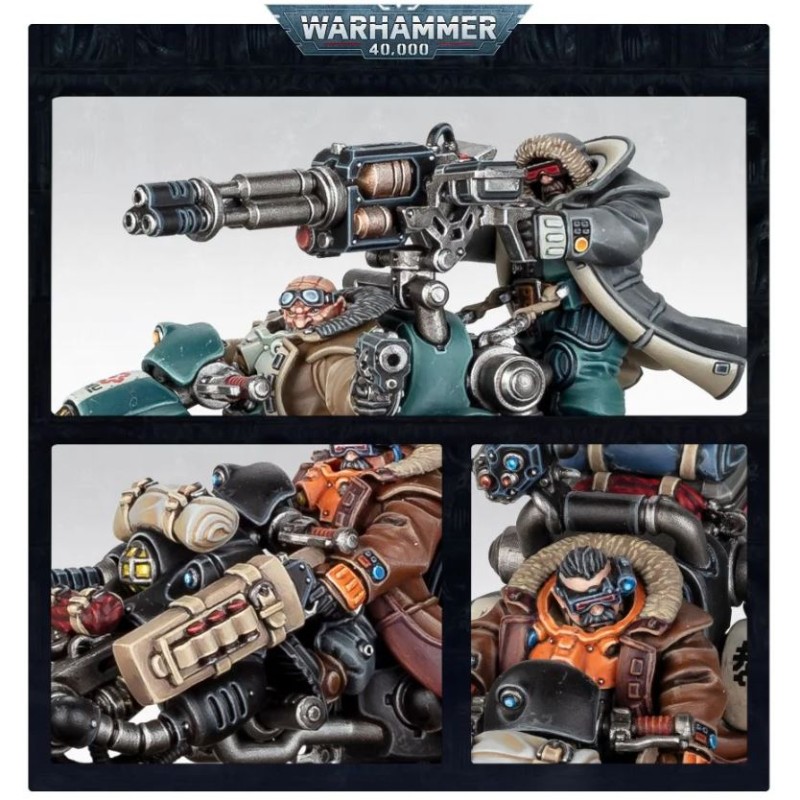 Ce kit palstique permet d'assembler trois Pionniers Hernkogs, des Cognats conduisant des motos antigrav manœuvrables. Chaque véhicule comprend un autocanon à magna-rail monté sur la coque, tandis que les pilotes sont armés de revolvers bolters et de fusils à pompe bolters, soit tenus en main soit accrochés à la moto, ainsi que de grenades à percussion gravitiques. Le kit contient un large choix d'équipement spécialisé : une moto peut être accompagnée d'un artilleur arrière utilisant soit un canon rotatif HYLaser soit un faisceau à ions, tandis que d'autres motos peuvent être équipées d'un Projecteur sur rail, d'une panoplie de transmission multibande ou d'un scanner panspectral. Vous trouverez également un large choix d'arimages et d'éléments esthétiques pour personnaliser chacune de vos motos, ainsi que 10 têtes différentes portant des lunettes, des capuches ou des bonnets de vol, dont une tête de Cognat de Fer.