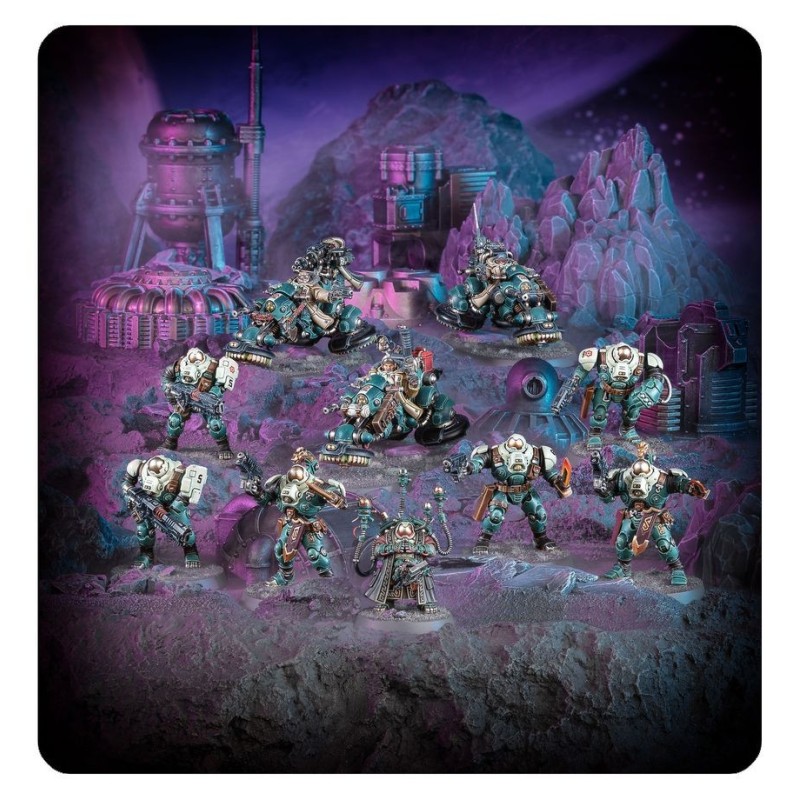 Cette boîte est idéale pour entamer une nouvelle collection des Ligues de Votann ou étoffer une armée existante, à déchaîner dans les parties de Warhammer 40,000 tout en faisant des économies par rapport à un achat des kits au détail. Cette force est menée par un Stratège Memnyr, escorté par des Chaudronniers Cognats de Fer polyvalents qui peuvent être équipés pour fournir un appui à distance ou pour lancer des assauts rapprochés. Les Pionniers Hernkogs ajoutent de la vitesse et de la puissance de frappe, et ils sont capables de capturer les objectifs éloignés et de perturber les plans ennemis. Le tout forme une force équilibrée et efficace, parfaite pour représenter un Détachement de Mercenaires Assermentés, dont les règles se trouvent dans The Maelstrom: L'Antre du Tyran – Détachements, disponible séparément.