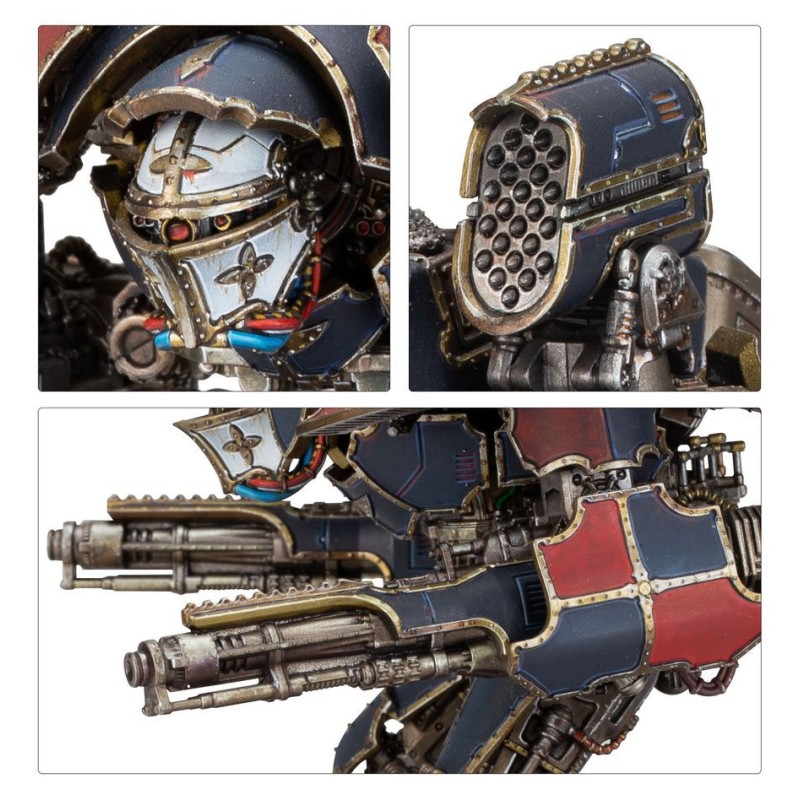 Ce kit vous propose de nombreuses manières de personnaliser votre Titan. Vous trouverez deux visières différentes et deux systèmes de capteurs différents pour la tête, ainsi que trois paires d'épaulettes: une avec le symbole sculpté de la Grande Croisade, une avec l'imagerie des Traîtres et une vierge. Le kit dispose d'articulations à différents endroits, ce qui vous permet de changer la position de votre Titan au niveau de la tête, des genoux, de la taille, et bien plus. Ses armes sont également ajustables pour pouvoir viser là où vous en avez besoin.