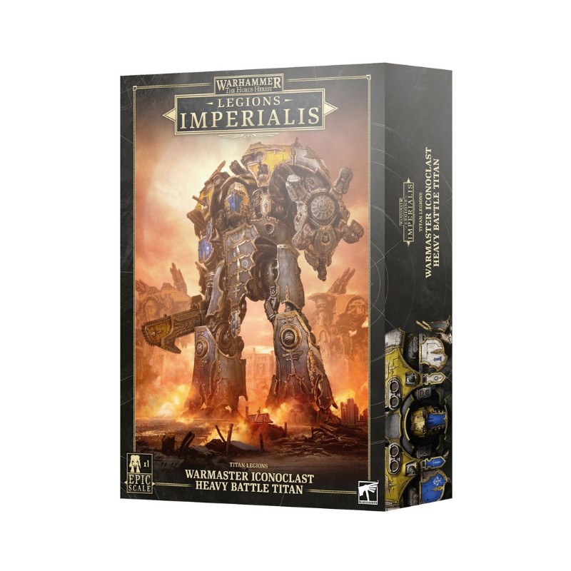 Ce kit en plastique permet d'assembler un Warmaster Iconoclast Titan à l'échelle epic. Cette énorme figurine est armée d'une colossale épée tronçonneuse Desolator et soit d'un trépan de siège Krius broyeur soit d'un puissant imploseur à gravitons Krius, ce qui en fait un monstre centré sur le corps à corps et sur lequel baser la stratégie agressive de votre armée ou de votre groupe de combat.