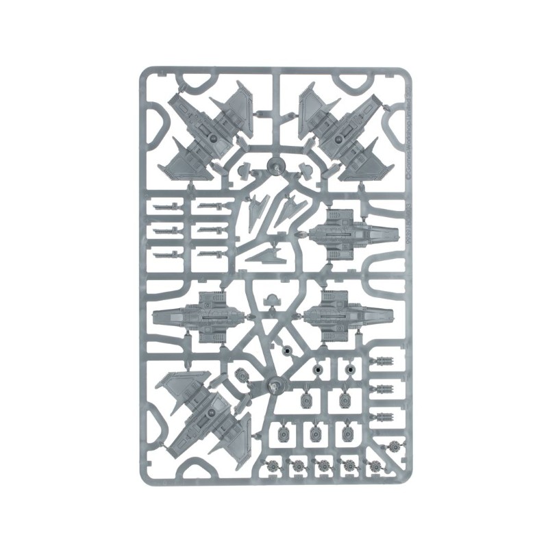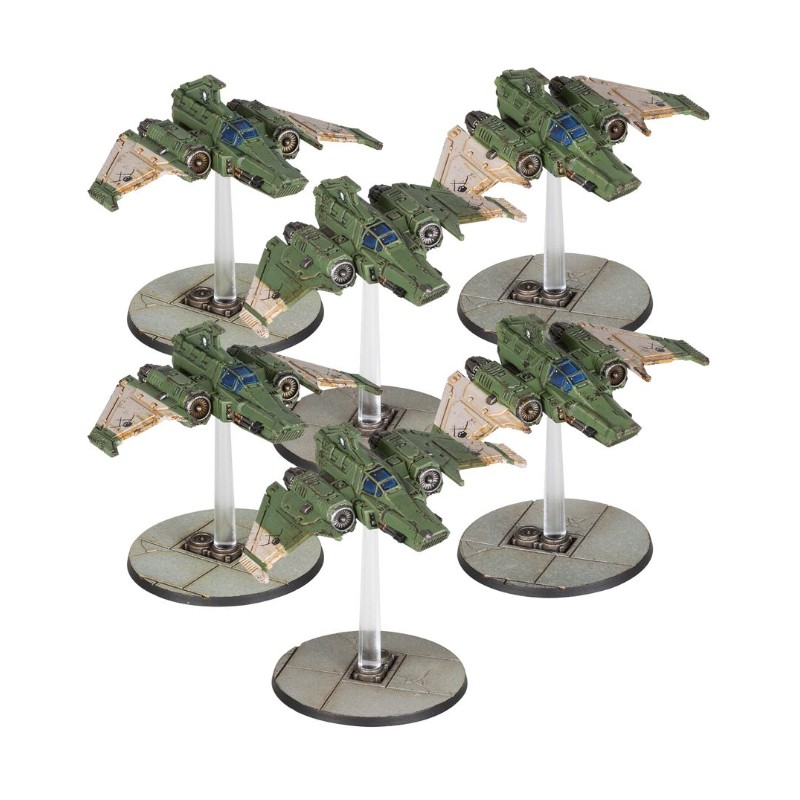 Plus difficiles à abattre que la plupart des chasseurs, et dotés d'une terrible puissance de feu prenant la forme de quatre canons laser et d'un système de missiles, les Xiphon Interceptors sont capables de déchiqueter même les plus farouches résistances. Les missiles frag peuvent être échangés contre des missiles krak pour transpercer les cibles au sol, ou contre des missiles traqueurs pour arracher la supériorité aérienne. Ces appareils peuvent rivaliser avec n'importe quel ennemi, et cette boîte vous en fournit pas moins de six pour soutenir votre armée