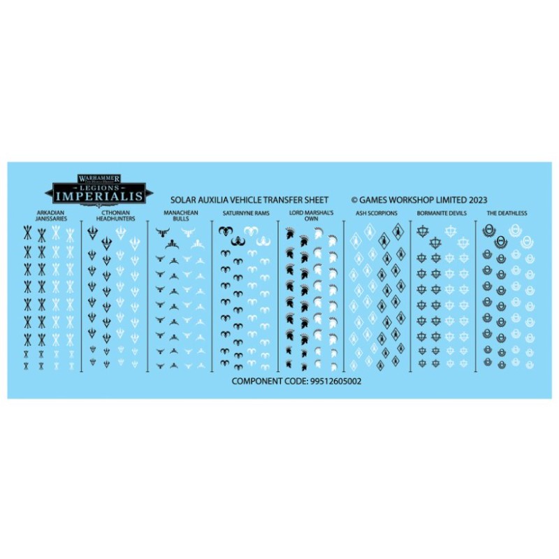 - 1x Planche de Décalcos de Véhicules des Solar Auxilia pour Legions Imperialis proposant 288 décalcos