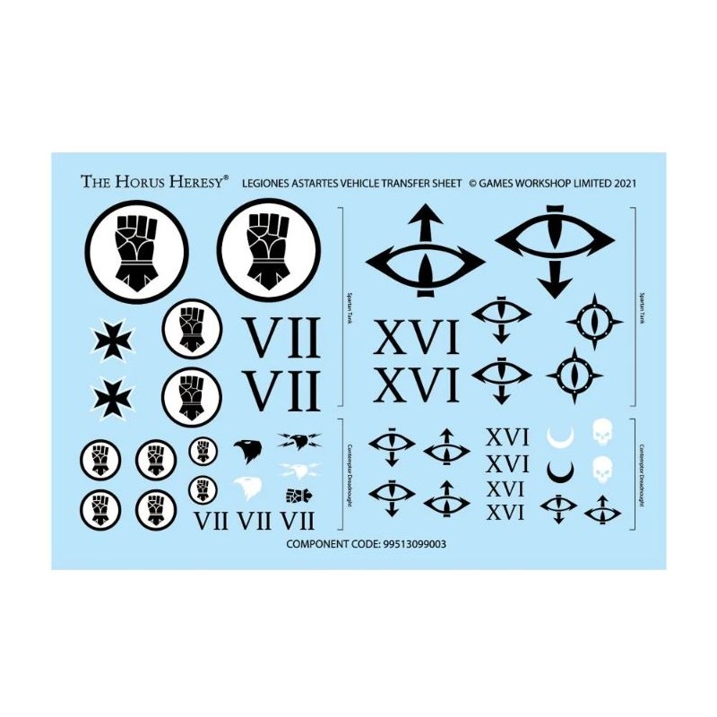 Cette figurine ne comporte pas de marquage de Légion, pour permettre aux hobbyistes de Warhammer de la peindre à leur guise. Ceci dit, la boîte contient une planche de décalcomanies avec 42 marquages optionnels et de l'iconographie pour les Légions des Sons of Horus et des Imperial Fists.