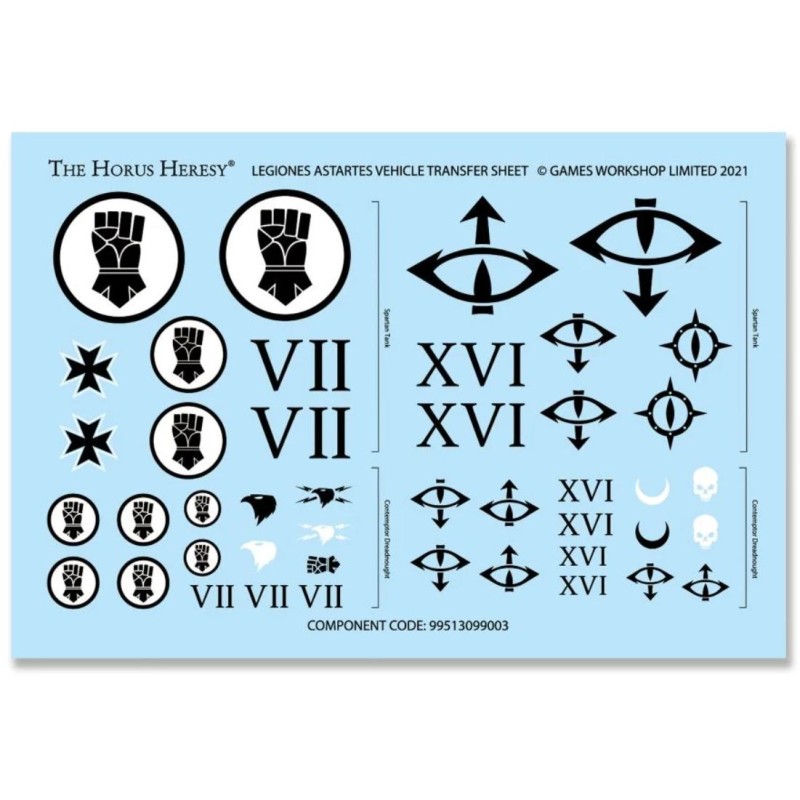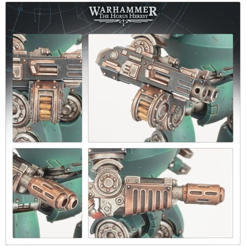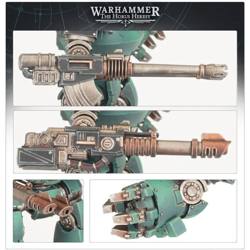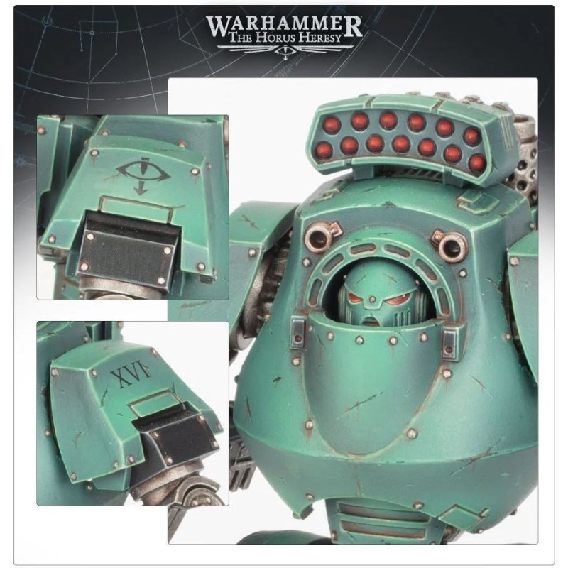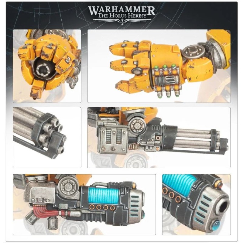 Ce set est constitué de 164 pièces en plastique, et est fourni avec un socle rond Citadel de 60 mm ainsi qu'une Planche de décalcomanies de Véhicules Legiones Astartes avec 44 marquages et icônes des Légions des Sons of Horus et des Imperial Fists. Cette figurine est fournie non peinte et nécessite assemblage.
