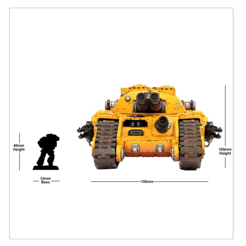 La tourelle, l'équipage et les armes montées sur la coque du char sont en résine, tandis que la coque est un mélange de résine et de plastique. Le char est également équipé d'une paire de lascannons en plastique montés sur un sponson, qui peuvent compléter son armement principal ou s'attaquer à des cibles moins bien blindées. La tourelle, les armes montées sur la coque, et les béquilles peuvent toutes être assemblées sans colle, ce qui vous permet d'ajuster leur positionnement en cours de combat.
