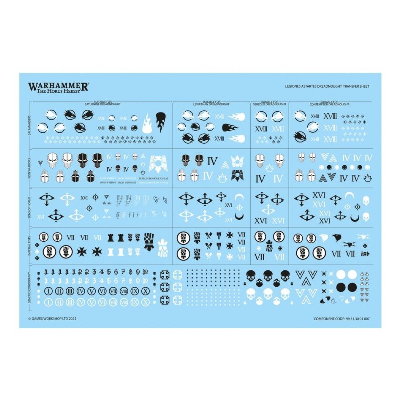 Ce kit est composé de 213 éléments en plastique, de 1x Socle Rond Citadel de 100mm et de 1x Planche de Décalcos de Dreadnought proposant 528 décalcos de grande qualité – comprenant de l'iconographie de Légion pour les Sons of Horus, les Imperial Fists, les Iron Warriors et les Salamanders – pour décorer vos figurines.
