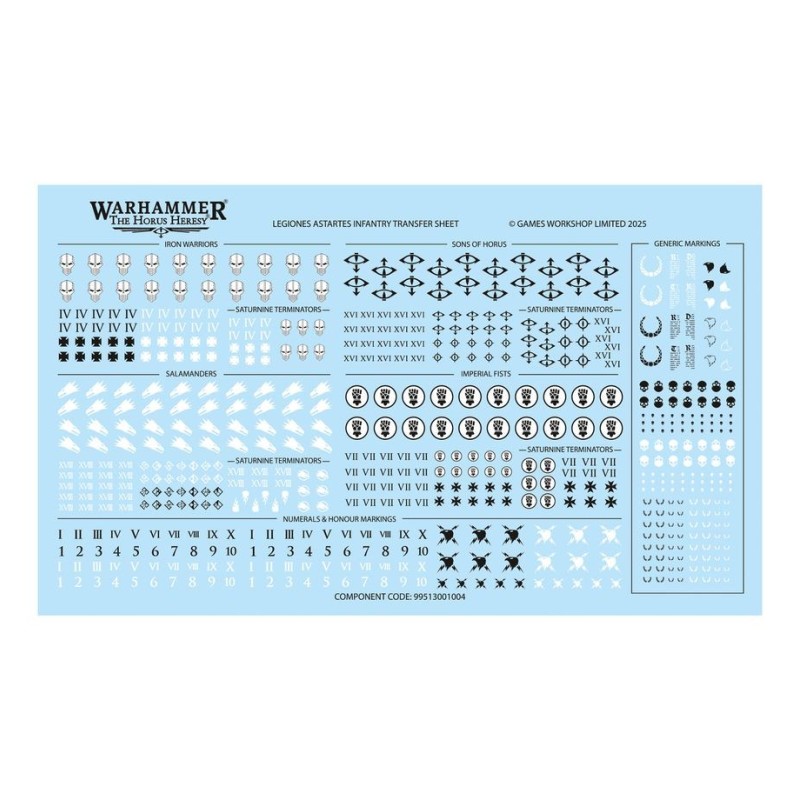 Ce kit est fourni avec 1x Planche de Décalcos d'Infanterie des Legiones Astartes comprenant 618 décalcos de grande qualité, dont des symboles des Légions des Iron Warriors, des Sons of Horus, des Salamanders et des Imperial Fists, ainsi que des chiffres, des marques d'honneur, des marquages génériques, des écritures et des icônes de commandement.