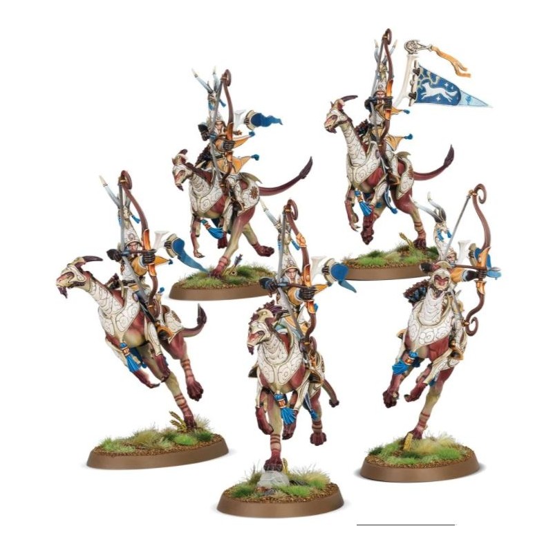 En tant qu'archers montés parmi les plus éminents des Royaumes Mortels, ces guerriers sans pareils sont aussi à l'aise pour tirer au galop que pour se ruer en mêlée. Leurs treerunners sont si agiles qu'ils négocient le terrain le plus dense comme s'il n'était pas là, ce qui rend cette cavalerie excellent pour déborder les flancs.