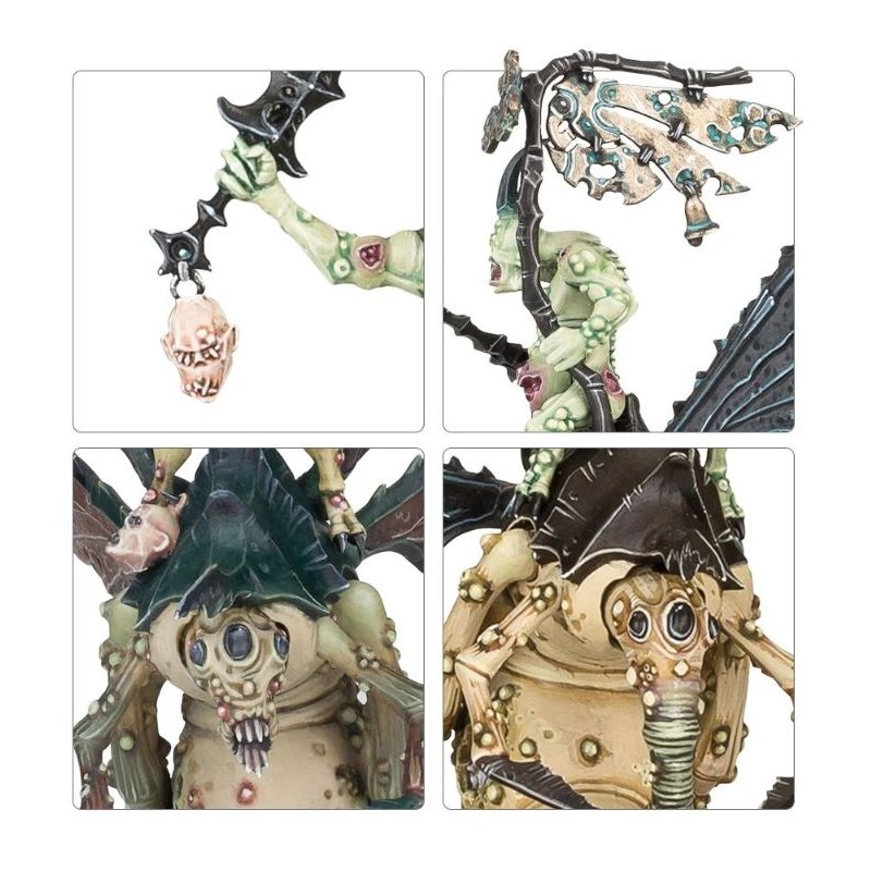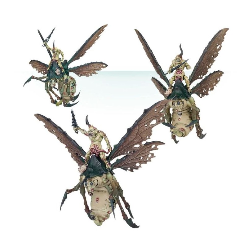 Dans une collection de créations repoussantes, il faut une chose particulièrement hideuse, comme les drones de la peste de Nurgle pour attirer l’attention. Sur chaque figurine, un portepeste est assis sur une énorme mouche à peste, qui possède deux paires de larges ailes en lambeaux collées à un corps bouffi constellé de bubons. Ces figurines exposent de ci de là leurs entrailles, et on distingue dans l’abdomen de l’une des créatures le visage horrifié d’une victime partiellement digérée. Chacune des trois mouches à peste est unique, avec des éléments variés comme des proboscis à pus, des mandibules et un dard. Les portepestes de son pas en reste et affichent un assortiment écœurant de dons de Nurgle, comme des furoncles, plaies béantes et des entrailles exposées. Ils arborent des cornes de forme diverses, et semblent agiter leurs bras maigres en brandissant des crânes et des lames grossières.