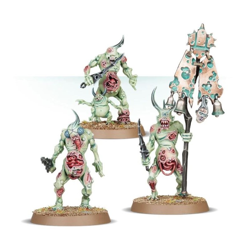 Ce kit plastique contient 74 pièces permettant d'assembler dix Plaguebearers de Nurgle. Il inclut de quoi assembler un état-major, y compris un Herald of Nurgle, un porte-étendard et un musicien. Fourni avec 10 socles ronds Citadel de 32mm.