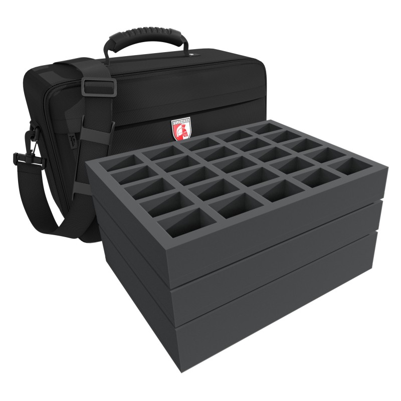 Dans la mallette maxi, vous pouvez ranger parfaitement 50 figurines sur grand socles (30 - 40 mm) et de gros chars ou monstre. Dans le sac se trouve une mousse pick & pluck de 60 mm de hauteur pour le rangement, la protection et le transport de chars ou de monstres.