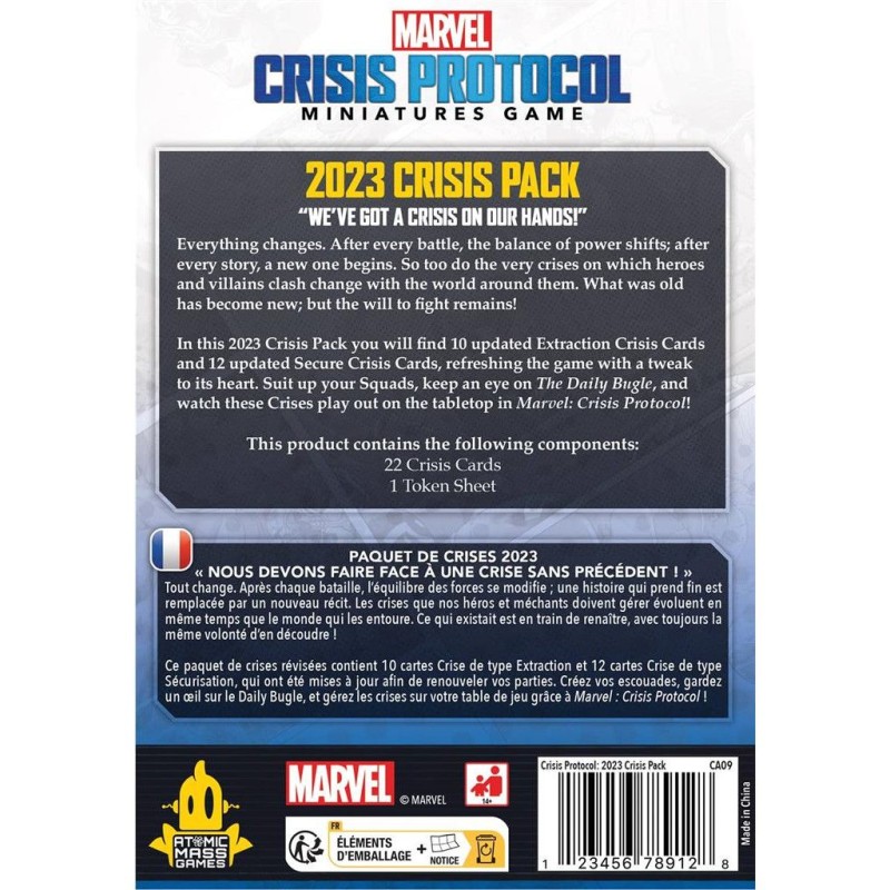 Description du produitCe paquet de 22 cartes contient les cartes de Crises mises à jour pour l'édition 2023 du jeu. Elles permettent aux vétérans de Crisis Protocol de mettre à jour leur jeu sans nécessairement disposer de la nouvelle boîte de base.