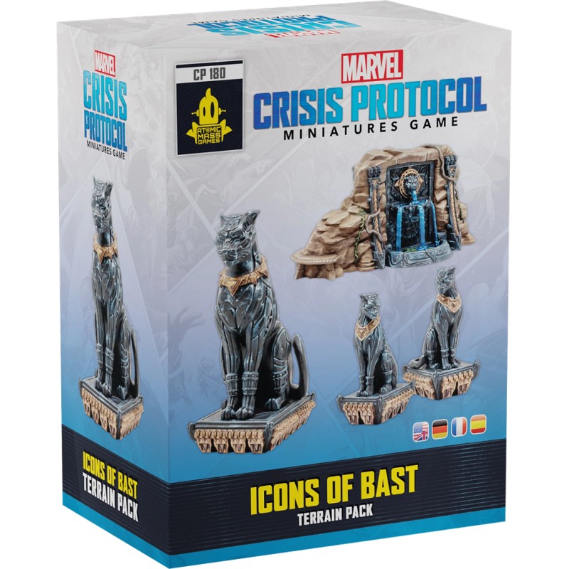 Cette extension pour Marvel Crisis Protocol contient 1 grande statue de panthère, 2 petites statues de panthère, 2 fontaines panthères, ainsi qu’une carte scénario inédite avec règles spéciales. Affrontez-vous sous le regard de la déesse, elle vous donnera du pouvoir supplémentaire. Et si un de vos personnages venait à être K.O. ou sonné, une statue se matérialise devant lui !