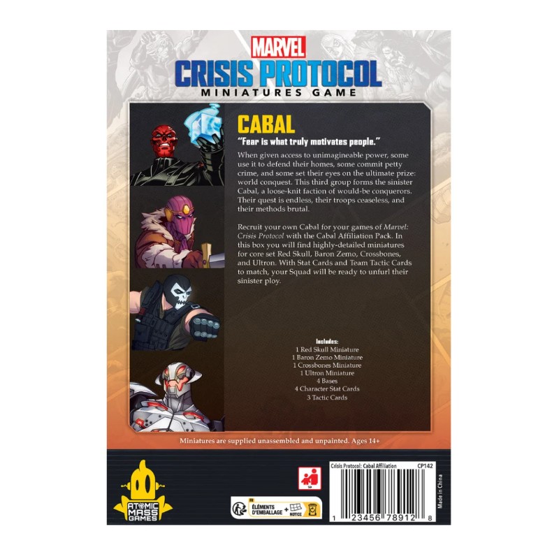 Le Pack d'Affiliation de la Cabale regroupe les personnages affiliés à la Cabale du Core Set original de Marvel : Crisis Protocol, dont Crâne Rouge, Crossbones, Baron Zemo et Ultron, dans une seule et même boîte accessible.