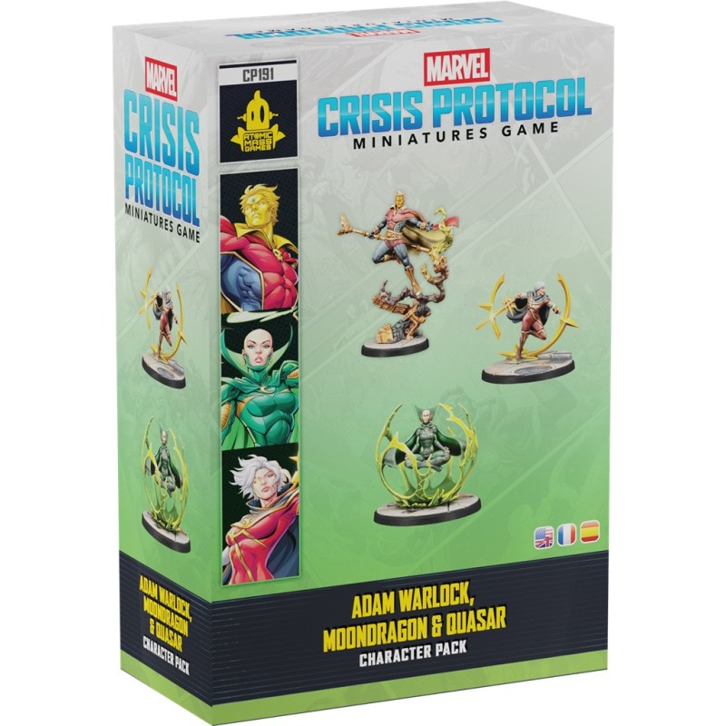 Conçu pour être l’être parfait, Warlock voyagea sur la Contre-Terre. Il y reçut le nom d’Adam et en devint son premier super-héros. Survivant à une attaque de Thanos, Moon Dragon perfectionna ses capacités psychiques dans le but de se venger du titan fou. Après avoir récupéré les Bracelets Quantiques d’Annihilus, Phyla-Vell décida d’utiliser leur pouvoir pour devenir le nouveau Quasar. Ils parcourent ensemble la galaxie pour la protéger de toutes sortes de menaces. Figurines à monter et non peintes. Nécessite une boîte de base de Marvel : Crisis Protocol™.