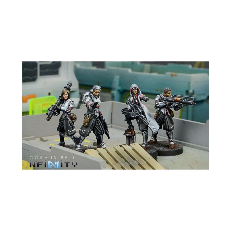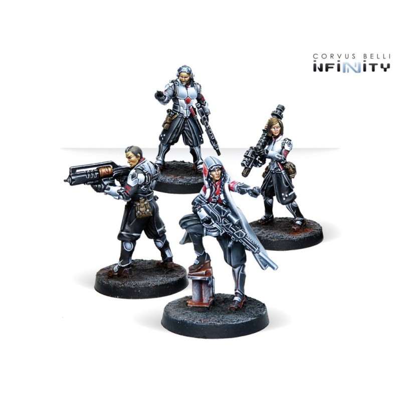 Ce blister contient 4 figurines en métal pour le jeu Infinity. Les socles sont inclus. Les figurines sont à assembler et à peindre.