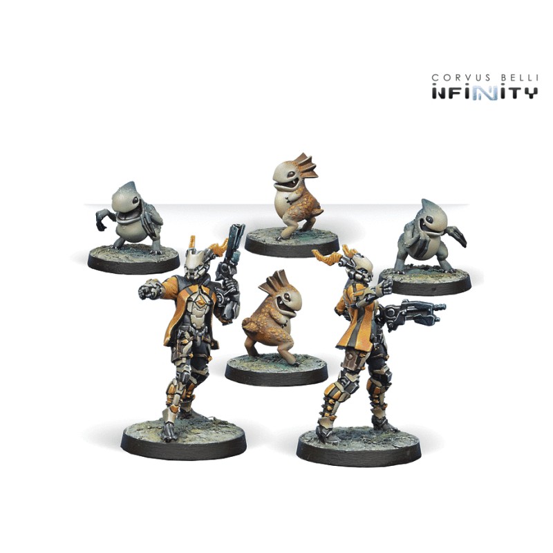 Profil : Les spécialistes Kaeltar constituent l'unité chargée des situations difficiles du Trident Tohaa. Ils ont été formés dans la discipline complexe de Corahtar pour contrôler les SymbioMates qui fournissent un soutien vital en améliorant les unités qui utilisent des engins symbiotiques et qui doivent faire face à une résistance particulièrement hostile et meurtrière. Leur tâche principale est d'utiliser leurs phéromones pour contenir et réduire les attaques ennemies. Pendant ce temps, avec leurs terribles SymbioBombs, ils peuvent augmenter le potentiel offensif des troupes portant une armure symbiotique. Cependant, la perspicacité tactique des spécialistes de Kaeltar va plus loin. En raison de leur spécialisation hautement technique et de leur profil particulier, intervenant toujours dans des opérations à haut risque, tous les sous-officiers du Kaeltar sont des commandants de haut rang avec une vaste expérience sur le terrain. Pour cette raison, les Kaeltar gardent toujours la tête froide au milieu du chaos et sont capables de prendre le commandement lorsque le chef d'équipe tombe et que la situation devient incontrôlable.