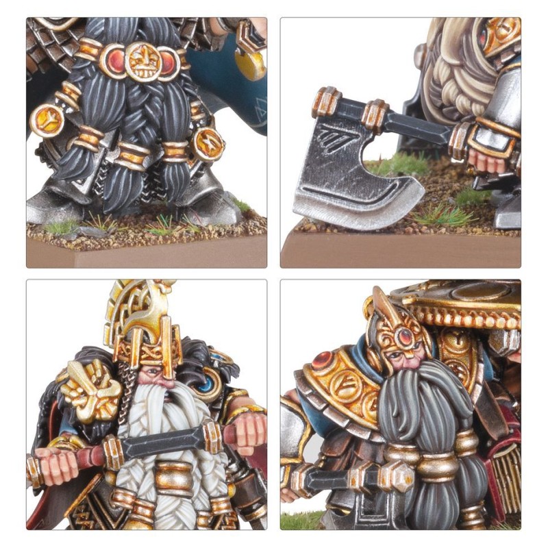 Ce kit plastique permet d'assembler deux Seigneurs Nains, l'un charrié par des Porteurs de Bouclier et l'autre se rendant au combat à pied, pour mener vos armées des Forteresses Naines. Le kit contient deux têtes barbues, deux heaumes à cimier ornementés et deux corps en armure qui peuvent être échangés selon n'importe quelle combinaison pour personnaliser vos puissants meneurs, n'importe lequel pouvant être monté sur les Porteurs de Boucliers fournis. Vous trouverez également des options d'armes pour assembler un Seigneur Nain avec une hache et un bouclier et l'autre avec une arme lourde, ainsi qu'un pistolet dans son holster et un sinistre insigne ancestral.