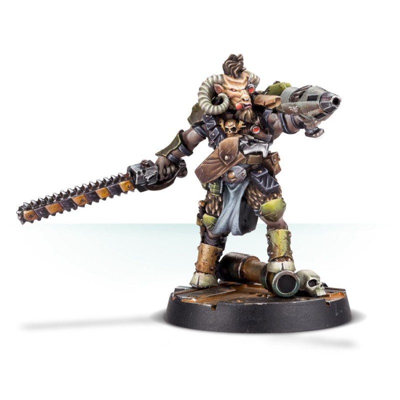 Ce kit en résine en plusieurs parties représente Gor Half-horn. Il s'agit d'une figurine grotesque, comme on peut s'y attendre de la part de quelqu'un qui a subi d'horribles mutations dans les souterrains - les traits de son visage animal sont encore déformés par ses augmentations cybernétiques (et l'expression sinistre d'un homme-bête prêt à tuer, qui mange son cigare). Il porte deux pistolets à étui - un stubgun et un fusil à pompe - qui accompagnent bien le pistolet à plasma serré dans sa main gauche. Sa main droite ? Elle est consacrée à une énorme épée à chaîne.