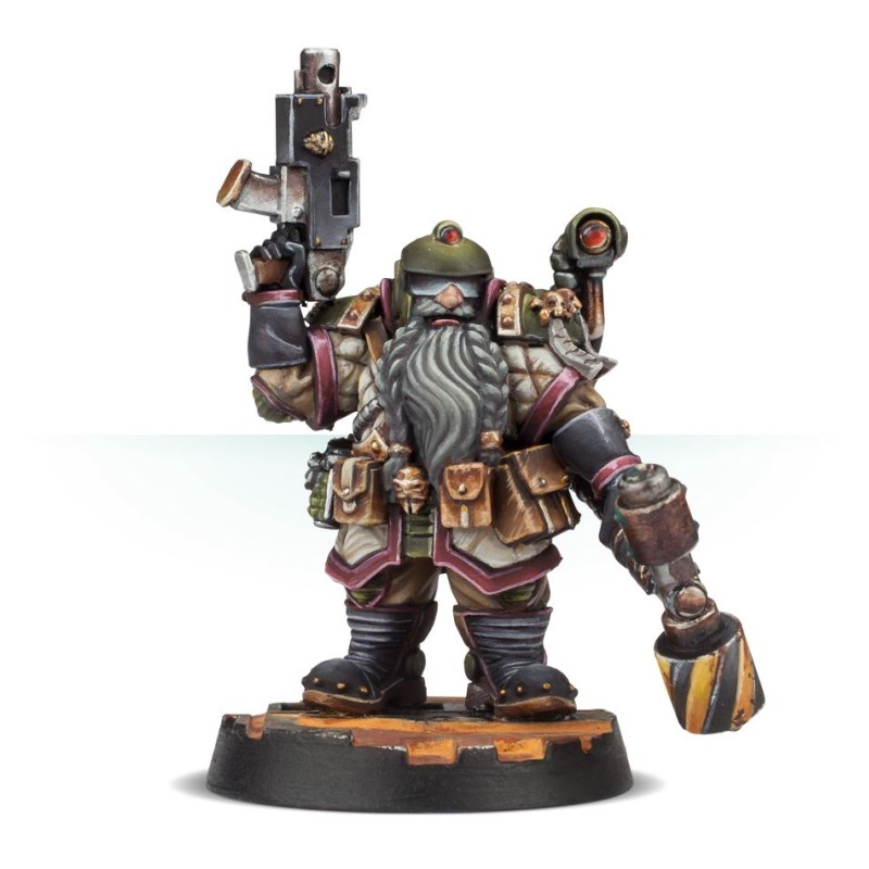 Ce kit en résine en plusieurs parties contient les éléments nécessaires pour assembler Grendl Grendlsen, un chasseur de primes Squat. D'une stature raisonnablement petite et trapue - c'est un Squat, après tout - il est impressionnant par son organisation et son équipement, bien plus que certains de ses rivaux chasseurs de primes. De la tête aux pieds, il porte des tas d'équipements : des poches et des sacs sont attachés à sa ceinture (ainsi que quelques grenades...), ses bottes et son manteau sont rembourrés et bien armés et il dispose même d'une belle protection oculaire tactique. Il porte également un grand sac à dos avec des capteurs, et dans sa main se trouvent les outils essentiels de son métier - un bolter à droite, et son légendaire marteau électrique à gauche.