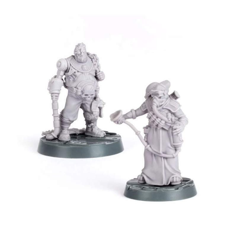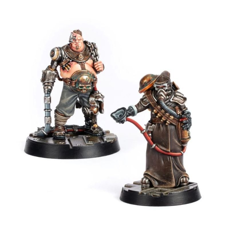 Ce kit en résine en plusieurs parties permet de construire un Brute Handler et un Chem Dealer, des parasites spécialisés disponibles dans tous les gangs, mais particulièrement courants dans les gangs de la Maison Goliath. Le Brute Handler est un personnage costaud, chaînes et menottes en bandoulière, criblé de dispositifs bioniques issus de séances d'entraînement dangereuses - un bras cybernétique se termine par un fouet à chocs enroulé. Le trafiquant de produits chimiques est vêtu de robes dissimulatrices, avec un recycleur facial relié à un réservoir de substances douteuses. Ils sont chargés de fioles et de bidons contenant leurs produits, prêts à offrir un échantillon.