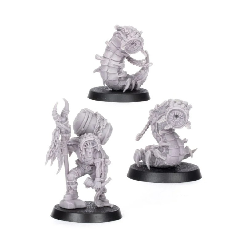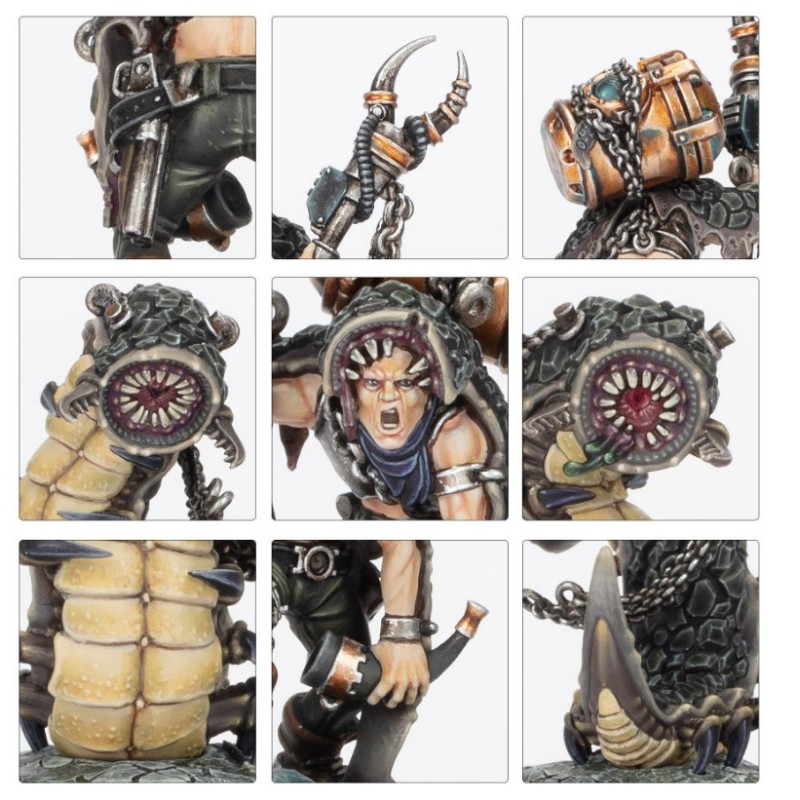 Ce kit en résine en plusieurs parties permet de construire un Beastmaster de l'Outland et deux Millisaurs - un Hanger-on pour n'importe quel gang, accompagné d'une paire de bêtes exotiques. Vêtu de la peau blindée d'un animal mort, le Beastmaster utilise son épée de choc pour repousser les créatures sauvages et les gangers ennemis. Il porte également un réservoir de provisions pour s'aventurer dans les profondeurs des terres ou sous la ruche, ainsi qu'un cor pour signaler la présence de ses animaux de compagnie depuis le sol. Leurs Millisaures sont une paire de vers grotesques aux pattes d'aiguille et aux mâchoires circulaires dentées, tenus en laisse par des chaînes martelées directement dans leurs peaux rocheuses.